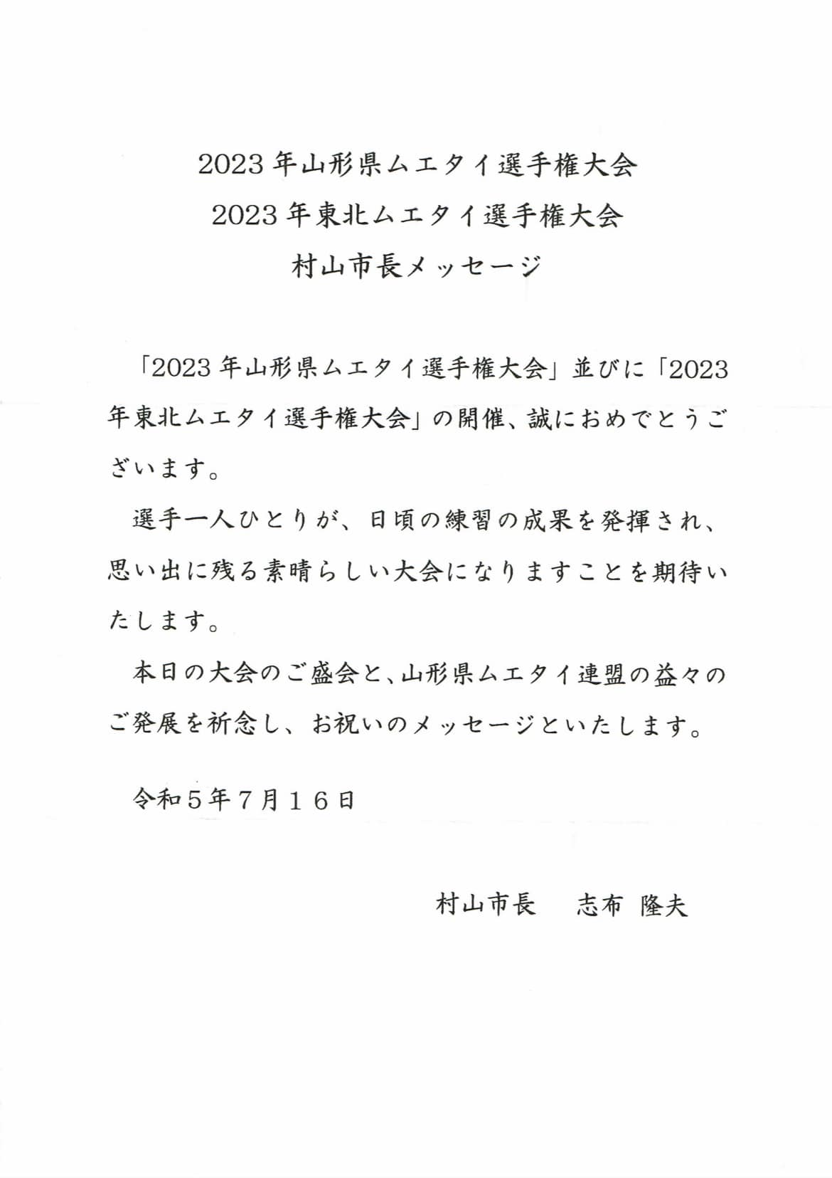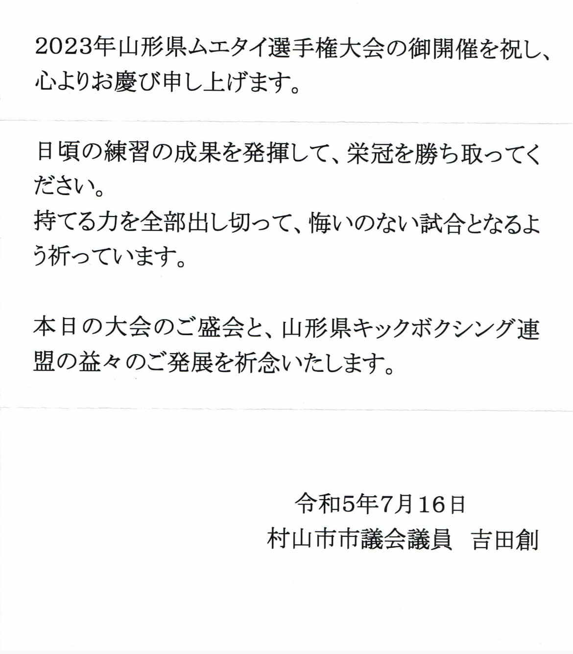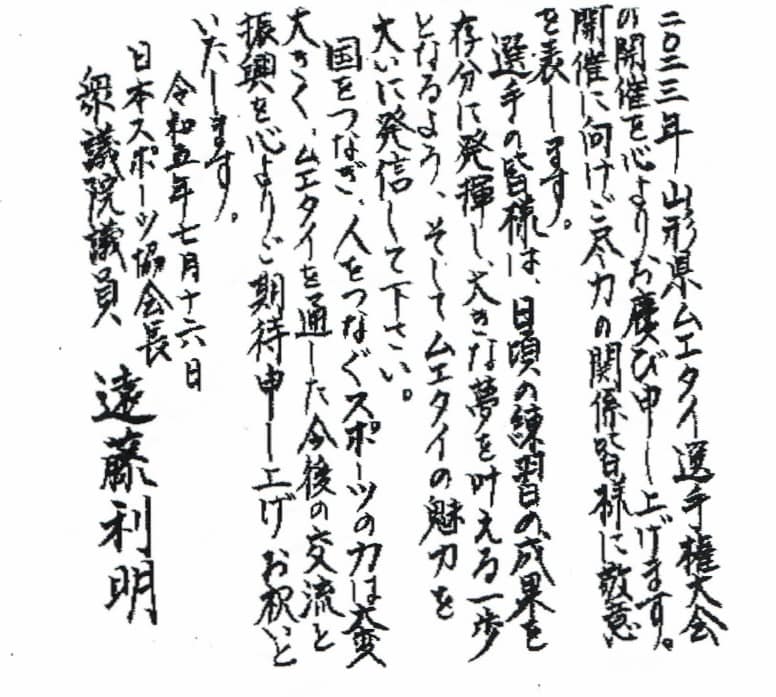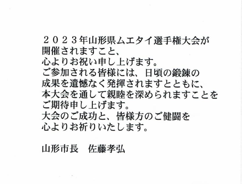 公益財団法人日本スポーツ協会長で衆議院議員遠藤利明様、山形市長佐藤孝弘様、村山市長志布隆夫様、村山市議会議員吉田創様からご祝電をいただきました、ありがとうございました。