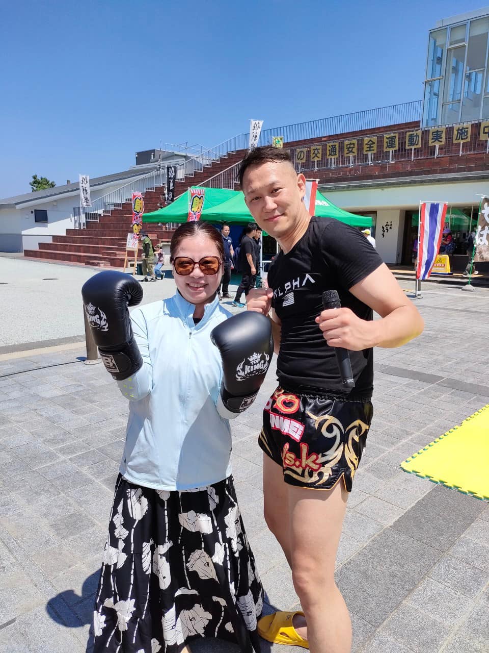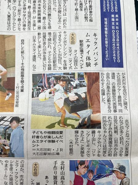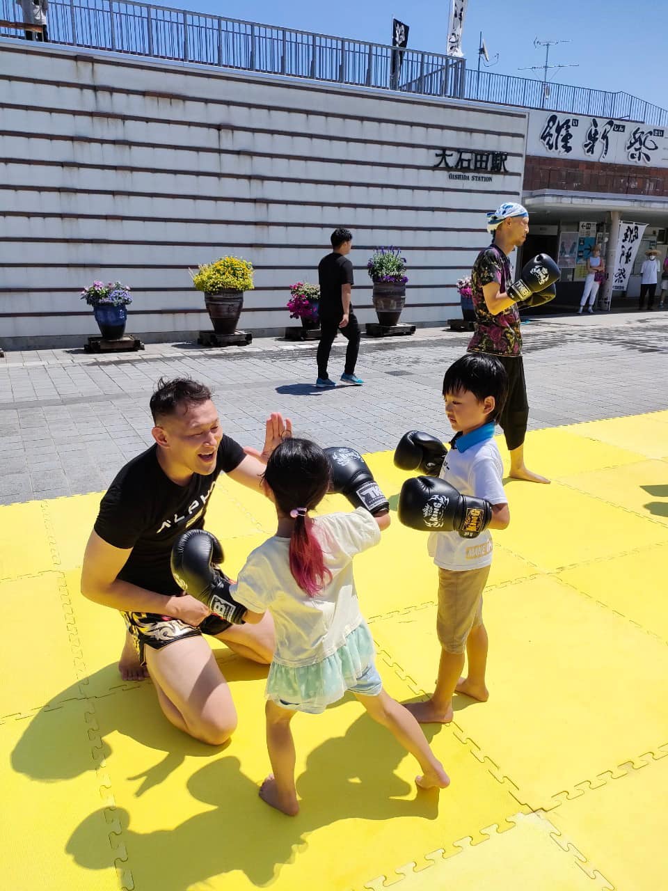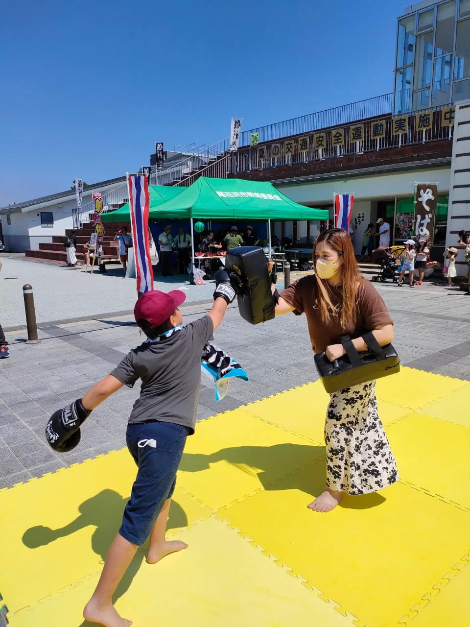 タイの国技ムエタイ(タイ式キックボクシング)を体験できるイベントが29日、大石田町のJR大石田駅前広場で開かれ、子どもや格闘技愛好者らが体を思い切り動かして楽しんだ。
