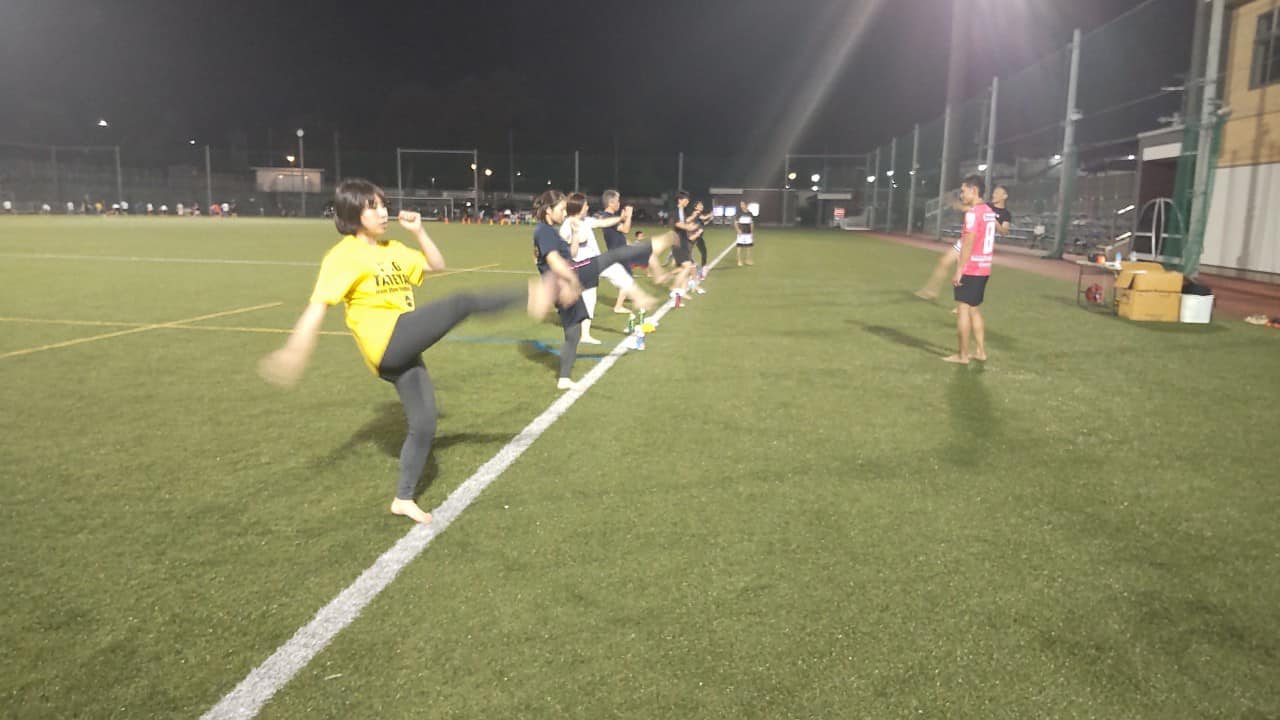 人工芝生の屋外サッカー場を豪勢に占有して裸足でムエタイ教室を全4回開催しました。