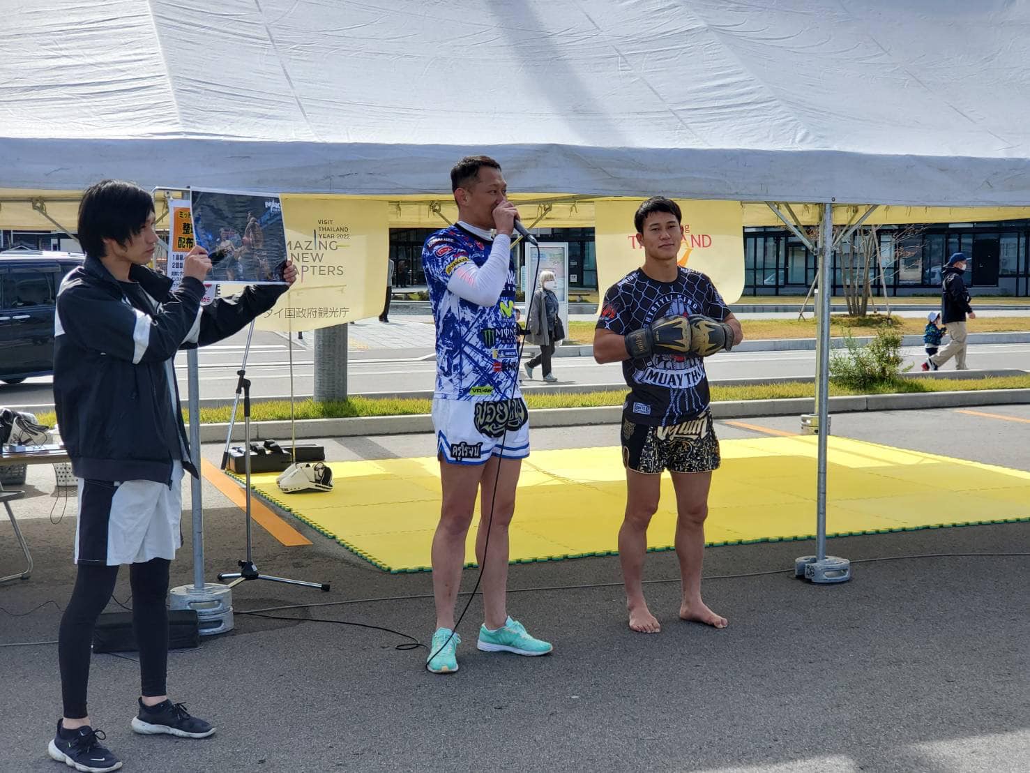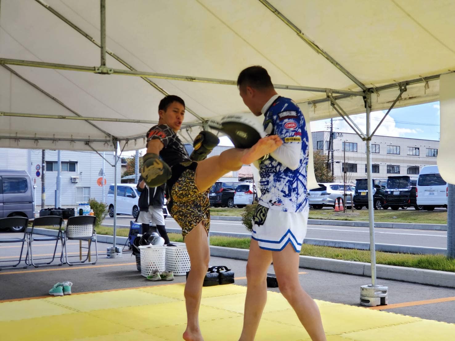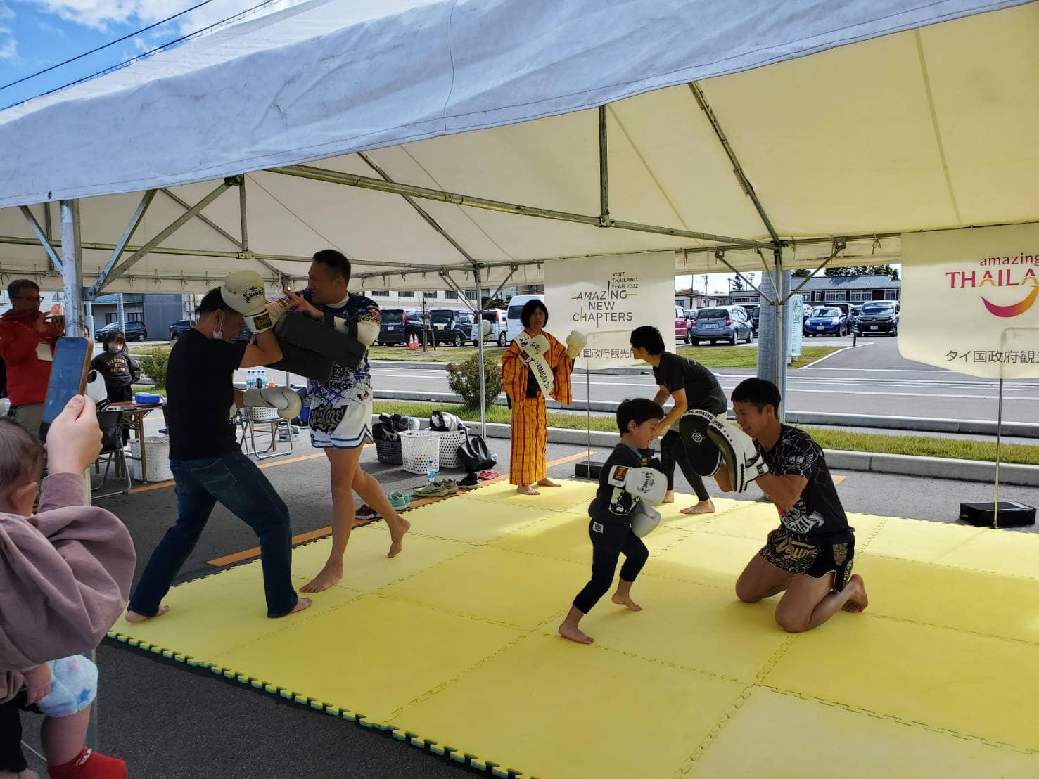 長井市フラワー長井線100周年祭りでムエタイ体験会。前日まであいにくの天候でしたが当日明け方に奇跡の回復。雨天に備え大型テント完備、スピーカー完備、しっかりした看板まで完備。