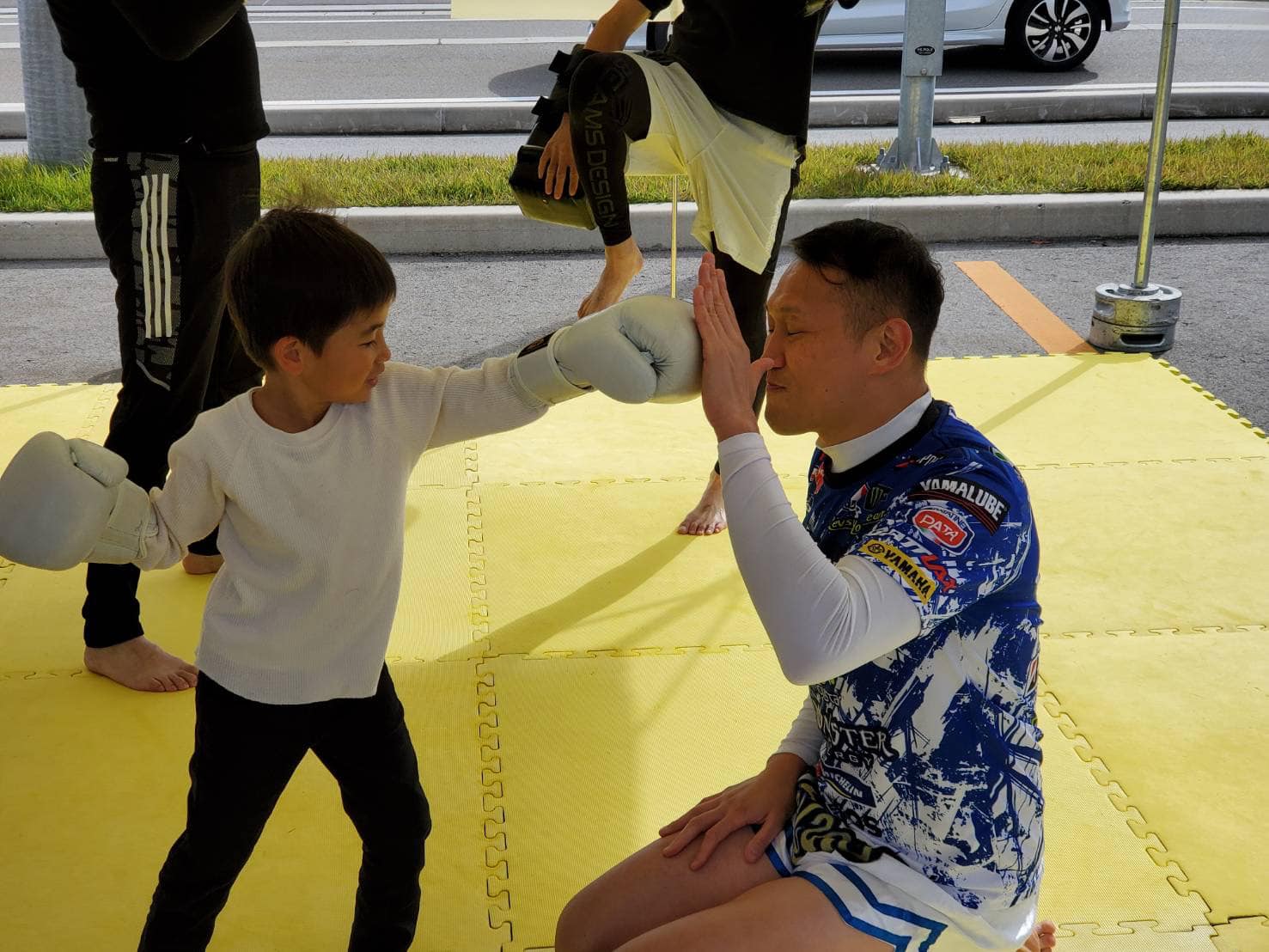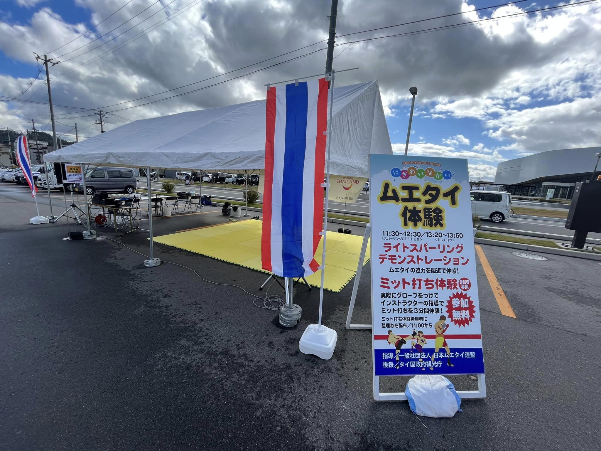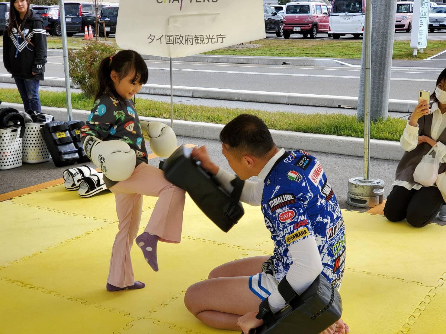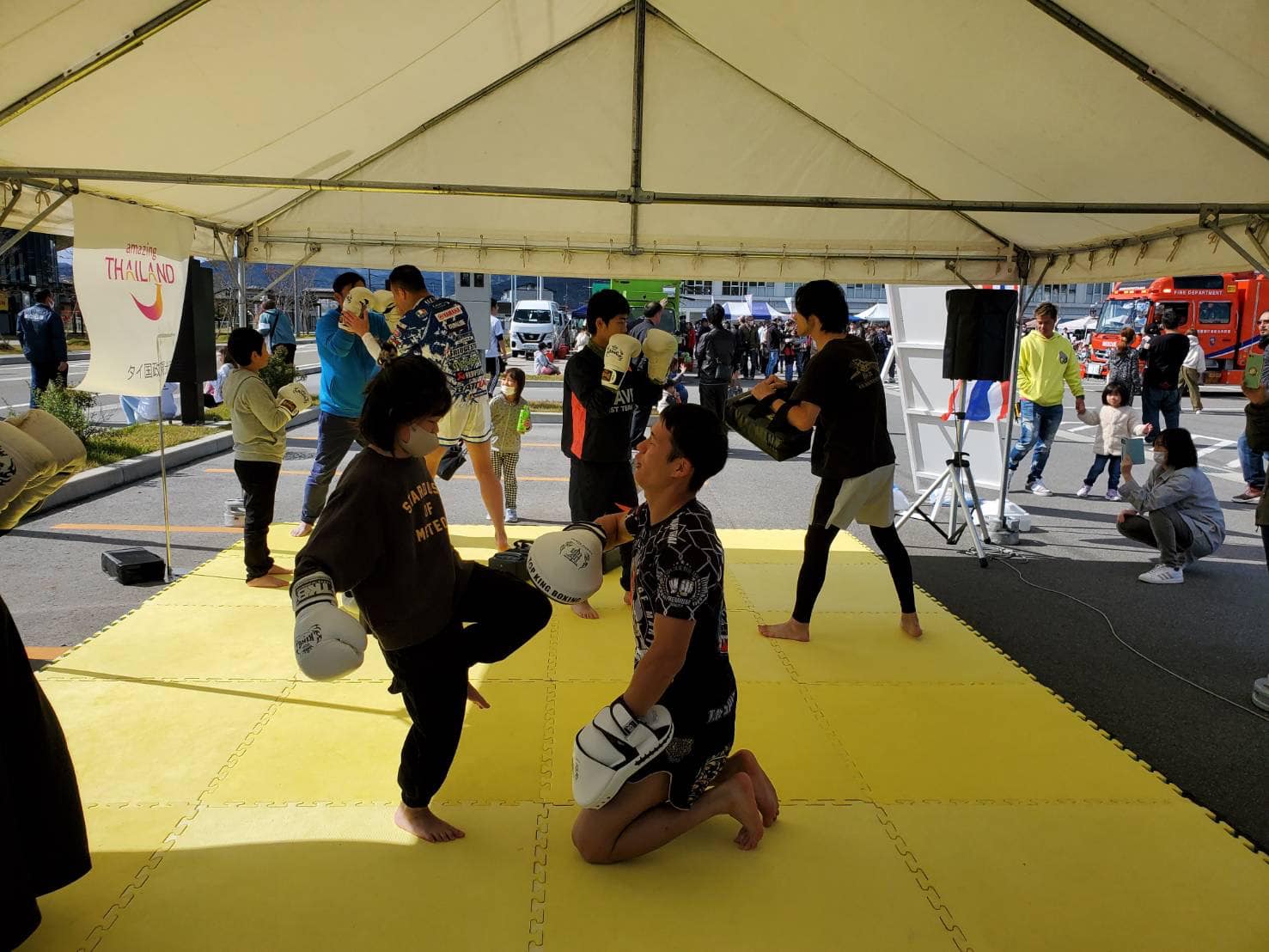 長井市フラワー長井線100周年祭りでムエタイ体験会。前日まであいにくの天候でしたが当日明け方に奇跡の回復。雨天に備え大型テント完備、スピーカー完備、しっかりした看板まで完備。